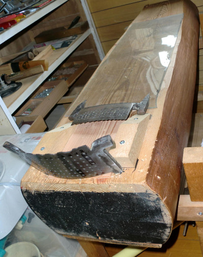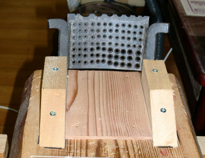 二つ目に「ひご通し」があります。竹を細かく切った後、さらにひご状に細くしていく刃です。父の手によって、刃をこのように固定させ、効率的にひごが通しやすいように工夫してあります。右下の太い穴から徐々に、小さな穴を通すことによって、どんどんひごが細丸く削られていきます。